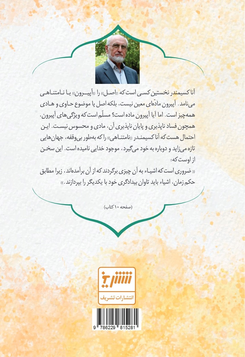 آناکسیمندر نخستین کسی است که “اصل” را “آپیرون” یا نامتناهی می نامد. آپیرون ماده‌ای معین نیست، بلکه اصل یا موضوع حاوی و هادی همه چیز است. آیا آپیرون ماده است؟ مسلم است که ویژگی های آپیرون همچون فساد ناپذیری و پایان ناپذیری آن، مادی و محسوس نیست. این احتمال هست که آناکسیمندر “نامتناهی” را که به طور بی وقفه، جهان هایی تازه می‌زاید و دوباره به خود می‌گیرد، موجود خدایی نامیده است. این سخن از اوست که:” ضروری است که اشیاء به آن چیزی برگردند که از آن برآمده‌اند، زیرا مطابق حکم زمان، اشیاء باید تاوان بیدادگری خود با یکدیگر را بپردازند.”
